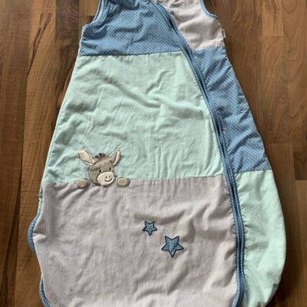 Das Material greift sich angenehm und ist weich. Er ist ärmellos und der Reisverschluss reicht vom Kragen über die Mitte nach unten und endet auf der linken Seite. Das ist super praktisch und gut durchdacht, denn sollte man nachts die Windeln einmal wechseln, muss der Schlafsack nicht unnötig ganz ausgezogen werden.